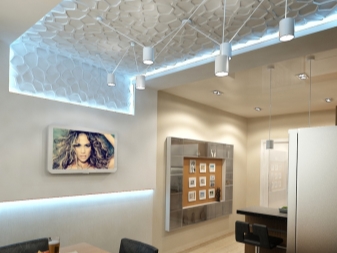 Осветлението е монтирано в кухнята, като се вземе предвид местоположението на функционалните зони. Гипсът е материал, който не абсорбира миризми, за разлика от абажурите от плат, поради което ви позволява да омекотите интериора без неприятни последици. С помощта на LED прожектори можете да осветявате работната повърхност и да изберете окачен таван от мазилка като централно осветление.