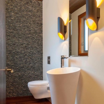 Отговаряйки на изискванията на времето, дизайнерите предлагат осветителни тела, изработени от високоякостна бяла пластмаса и декорирани с дървени детайли..