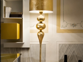 - Позлатен крак на този модел подови лампи прави стаята „богата“. Такава лампа определено ще се превърне в акцент в стаята..