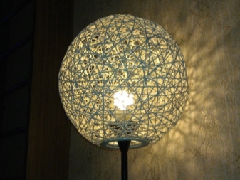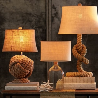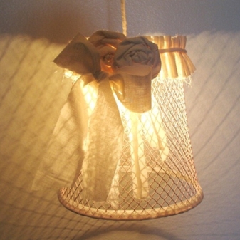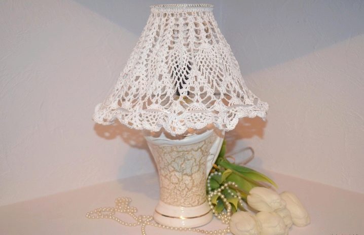 - Трикотажни опции. Ако в такива модели е използвана плътна прежда, те ще изглеждат малко груби. В същото време лампите с плътни плетени капачки могат успешно да бъдат монтирани в таванско помещение. За по -романтични натури можете да изберете ажурни модели..