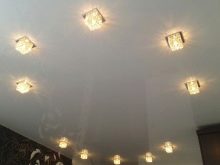 Ако халогенни, енергоспестяващи лампи са подходящи и за плат, тогава само LED лампи са за PVC фолио. Материята понася по -добре високи температури. Моделите с дифузер и призматични пречупващи елементи изглеждат доста интересни..