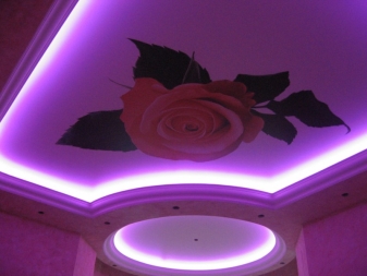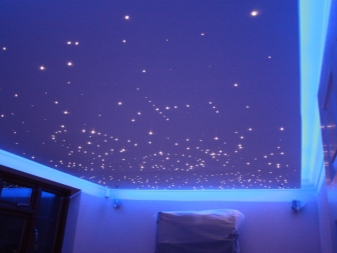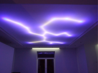 В тавани, декорирани с гипсокартон и опънат филм, често се монтира скрито осветление. Тя осветява платното по периметъра, създава интересни светлинни сцени. Има и специални профили, направени от прозрачно фолио. Заедно с правилно подбрани осветителни тела се създава ефект, че опъващата структура блести и блести отвътре. В този случай дизайнерите често си играят с форми, размери, изобразяващи тавана под формата на илюминатор с изглед към „пространството“, морското дъно или небето..