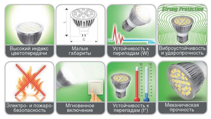 LED лампите за дома също имат своите предимства – те са проектирани за 220 V, могат да се управляват дистанционно с димери, което ще ви позволи да контролирате яркостта на светлината в помещението. Домашните светодиоди също могат да бъдат избрани в различни нюанси: топло, неутрално или студено бяло. Приятен ефект върху семейния бюджет е, че такива лампи са енергоспестяващи и ще използват само 11W / h, за разлика от 20W конвенционалните лампи. Те са безопасни за здравето, не произвеждат никаква ултравиолетова или друга радиация, така че могат безопасно да се използват дори в стаята, където живее детето..