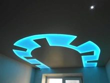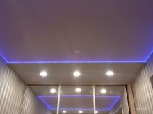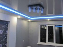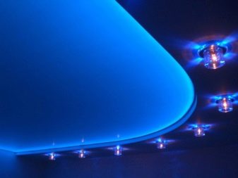 - LED осветлението работи върху прозрачността на опънатия таван. Ако филмът е бял, тогава можете да изберете светодиоди, които дават цветно осветление. В този случай се получава нежна светлина от син, светлозелен, розов или люляков цвят. Ако светодиодите са бели, осветлението ще бъде слабо. Също така тази опция се използва за симулиране на звездното небе. Разликата е, че за всеки светодиод се пробива дупка във филма, която се фиксира с пръстен за връзване, така че филмът да не се разпръсне от напрежението..