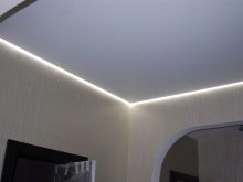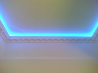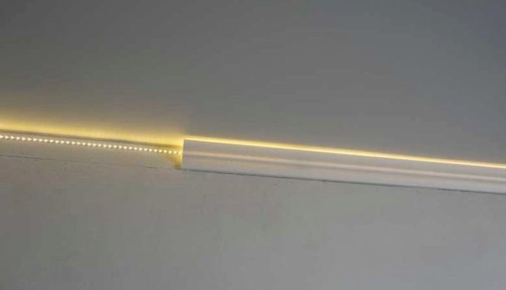 При такава инсталация е много важно инсталираната LED лента да е под нивото на цокъла, в противен случай всичките й елементи ще бъдат видими под формата на пунктирана линия. Первазът също трябва да бъде залепен по права линия. Ръбът, от който се отразяват лъчите светлина, не трябва да бъде замърсен отвътре с шпакловка или лепило. В противен случай лентата за подсветка ще бъде скъсана и неравна..