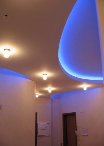 - Синият акцент показва най -малките дефекти в тавана. Ето защо е по -добре да използвате синьо за опънати тавани. Дори идеално завършеният таван от гипсокартон може да изглежда дефектен при този вид осветление..