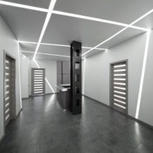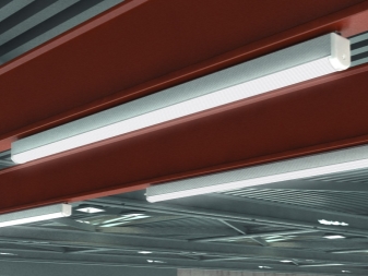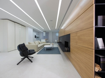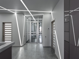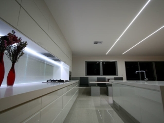 Вградените линейни LED осветителни тела са най-трудните за инсталиране. Това се дължи на факта, че повърхността първо трябва да бъде подготвена. В този случай линейният осветител е инсталиран в ниша. Въпреки че е монтиран в ниша, самото осветително тяло излиза значително извън границите си. Вградените осветителни тела са предназначени за интериори с опънати тавани. В същото време няма да е трудно да свържете проводниците към лампите..