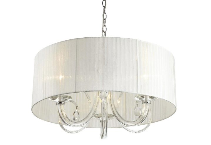 Общо ще ви трябват 6 лампи с нажежаема жичка, подходящи за базата E14 – до 40 вата. Кръгли текстилни нюанси са направени в бяло. Използват се хромирани метални фитинги. Цената на полилея Snow 1698-6P е малко повече от 25 хиляди рубли.