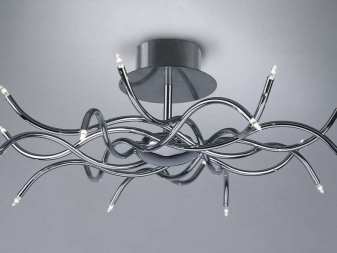 - Най -често има много странни форми. Ясните линии и ъгли не са добре дошли в съвременния стил. Полилеят изглежда симетричен, спретнато направен, с гладки извивки;