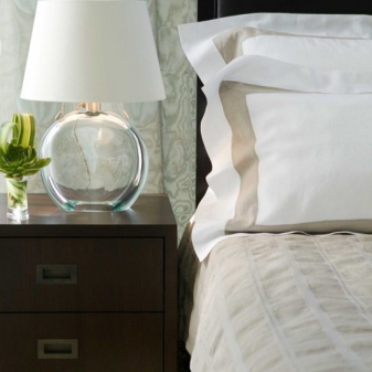 За нощни шкафчета моделите с плътен абажур от плат, пластмаса, матирано стъкло или метал ще бъдат най -добрият избор..