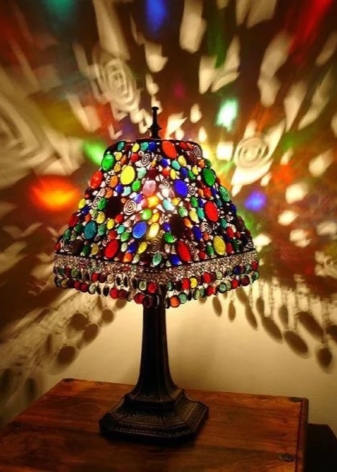 На абажура от плат можете на случаен принцип да шиете многоцветни копчета с различни размери и форми или да поставите всеки модел с тях.