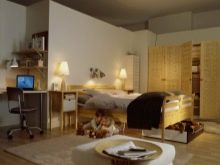 За заемането на празното пространство в зоната, която изисква осветление, ще помогнат стенни трансформиращи лампи и подови опции с маса в комплекта.