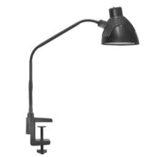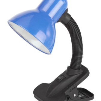 - На щипка за дрехи. Този монтаж обикновено се намира в доста електрически крушки. Удобството им е, че можете да фиксирате лампата не само върху страничната повърхност на масата, но и върху рафта за книги и всеки перваз над масата. По -трудно е да изпуснете такава лампа, но трябва да сте много внимателни при избора на фиби. Ако не е силна, лампата няма да залепне за наклонена повърхност;