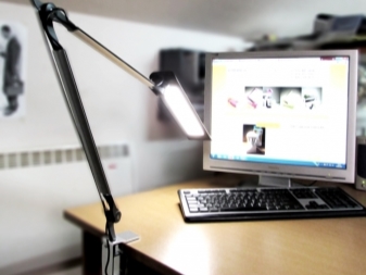 За компютърно бюро са подходящи не обикновени модели с кръгли нюанси, а удължени, които добре осветяват областта около компютъра и осветяват клавиатурата. Такива лампи могат да работят от електрическата мрежа или от USB входа. За осветяване на цялата повърхност на масата се използват големи лампи, за осветяване на клавиатурата се произвеждат компактни мини-лампи, които се вкарват в USB входа като флаш устройства. Но основният критерий за избор не е размерът на лампата, а подходящата яркост и цветна температура, което няма да усложни работата пред монитора..