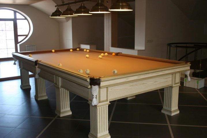 Настолна лампа за билярдна маса изглежда специфична. По -правилно би било да го наречем над масата, тъй като за удобство на играчите осветителните устройства са поставени на кратко разстояние над масата по целия периметър. Тези минималистични нюанси с отразяваща повърхност отвътре осигуряват добро и равномерно осветяване на цялата зона за игра.