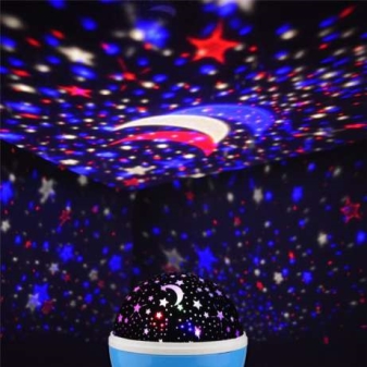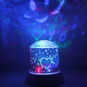 Включвайки такава лампа, вие също няма да видите реалистични съзвездия. Въртяща се нощна светлина ще излъчва многобройни светлинни петна върху стените, които ще се движат, докато тялото й се върти.. Контурите на звездите могат да изглеждат остри или замъглени в зависимост от модела.. Някои лампи проектират не само звезди и месец, но и сърца и други изображения..