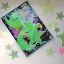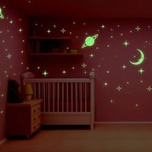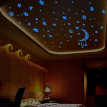 Можете да получите ефекта на искрящи звезди на тавана не само с помощта на специална лампа. Флуоресцентните стикери под формата на Луна, Луна, комети, звезди или цели съзвездия, летящи покрай тях, могат да създадат еднакво вълшебна атмосфера.