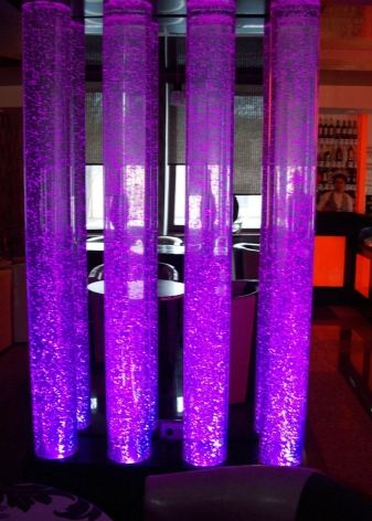Доста често се срещат балонни подови лампи.. Те са направени от плътна прозрачна тръба с всякаква форма, която от своя страна се пълни с вода, смесена с глицерин. Отделен механизъм осигурява образуването на мехурчета, които се издигат през цялото време нагоре. Често такива нюанси са оборудвани с LED подсветка, която също се регулира и променя в различни режими. Ще бъде трудно да се постави такава лампа в сложно обмислен интериор, тъй като нейната функция не е толкова да украсява интериора, колкото психологически, релаксиращ ефект..