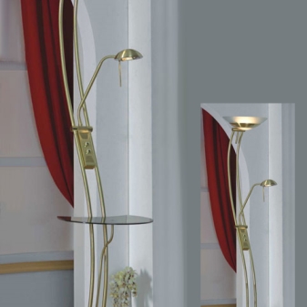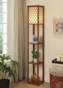 Най -практичният модел е подовата лампа с рафт, който от своя страна може да бъде отворен или с чекмедже. Тази опция е подходяща за тези, които предпочитат пространство, ред и искат да се откажат от обемността..