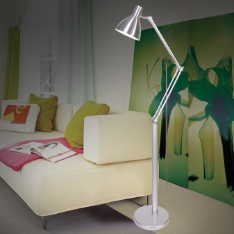 Подова лампа „въдица“ или наклонена върху извит (извит) крак – практично и модерно решение, най -простият и удобен вариант в експлоатация. Формата му ви позволява да избирате ъгъла на падане и наклон на осветлението, което е добре, когато използвате устройството на работното място. Има модели, които ви позволяват да променяте не само ъгъла на плафона, но и височината. Такова регулируемо гъвкаво устройство се превърна в част от ежедневието..