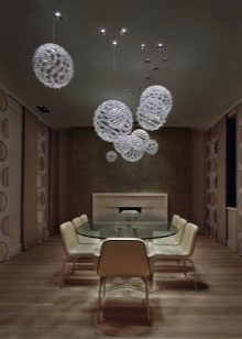 Оригинален полилей под формата на фонтан с червени и прозрачни топки в краищата на извити метални тръби. Горната част е изработена от метал със сребристо покритие. Перфектно съвпада с червеникавокафявите стени и белите мебели в трапезарията.