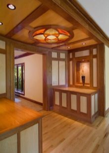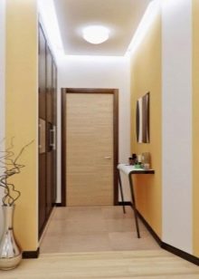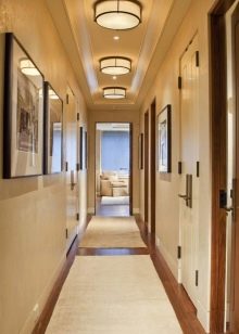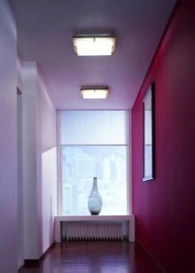 Инсталирането на няколко вградени таванни панели е отличен вариант за коридор, който ви позволява напълно да го осветявате и в същото време да не „изядете“ вече ограничено пространство. Като източници на осветление бяха избрани халогенни крушки, даващи дори светлина, но по -евтини от светодиодите.