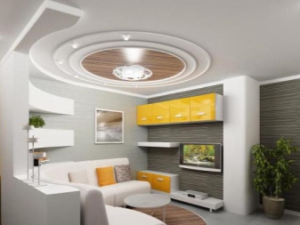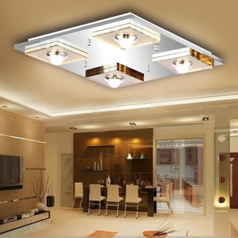 Когато избирате форма, трябва да се съсредоточите не само върху стила на стаята, но и върху нейния размер. Кръглите полилеи, макар и универсални, се предлагат в различни диаметри, докато твърде големият квадратен панел ще изглежда смешен. Най -добрият вариант в този случай би бил да поставите няколко квадратни таванни лампи, които приличат на една композиция..