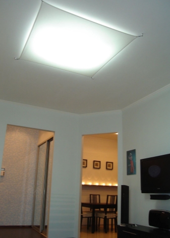 - Вграден. Сложната инсталация на такива конструкции се компенсира от факта, че те изобщо не заемат място, сливайки се с равнината на тавана. Подходящ само за шарнирни конструкции (грилято, напрежение и т.н.). Липсата на вентилация може да причини пожар, затова силно се препоръчва да изберете светодиоди за осветление.