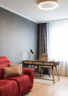 Дискретна лампа за хапчета перфектно допълва индустриален стил, и недостатъчното осветление се компенсира от точкови светодиоди и лампа за прожектор отгоре. Такъв избор на осветителни елементи ви позволява да спестите място в малка стая и в същото време да направите визуално по -голяма височината на таваните.