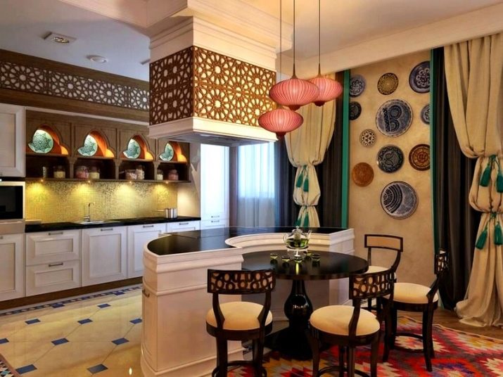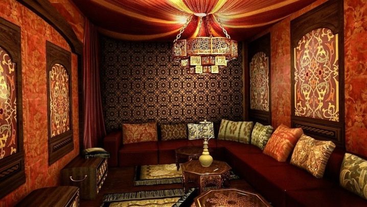 Много луксозни детайли са използвани в арабския интериор. Ето защо е много важно всичко да е обмислено до най -малките детайли. Всички части на интериора трябва да се комбинират помежду си, било то рисуване върху килими, шарки върху полилей или бродерия върху покривала. Само в този случай модерна стая в арабски стил ще се окаже обмислена и стилна..