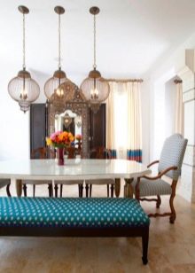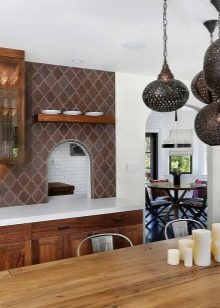 Стаите в марокански стил, като правило, се допълват само от един основен източник на светлина – обикновен полилей на тавана, направен под формата на изящен шестоъгълник. Най -често такива полилеи се правят ръчно, като се обръща много внимание на всички детайли..