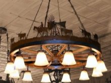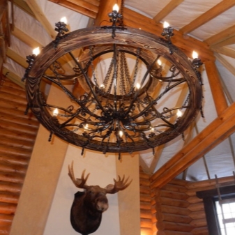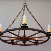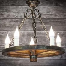 Извън прозореца е ерата на иновативните технологии, но все още широко разпространени антични декори и стилове, склонни към етно. Най -често те се използват за украса на тематични кафенета, ресторанти, хотели и други подобни заведения. Отделни предмети (големи греди от естествено дърво, подкови, колички и други) украсяват апартаменти и селски къщи. За да украсите стаята по необичаен начин, можете да поставите полилей във формата на колело в центъра на стаята. Такава лампа ще привлече вниманието на всеки, който идва в къщата ви..