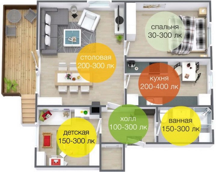 Eима определени стандарти за вътрешно осветление. Те са предназначени за конвенционална лампа с нажежаема жичка, но като се вземе предвид коефициентът на корекция, те могат лесно да бъдат преобразувани в енергоспестяващи източници на светлина. За 1 кв. метър стая, която изисква ярка светлина (кухня, хол) се нуждае от поне 20 вата. За помещения със средно осветление (баня, детска стая) – 18 W на 1 кв. м. Стая с приглушена светлина (спалня) ще се нуждае от около 12 W на 1 кв. м. м.