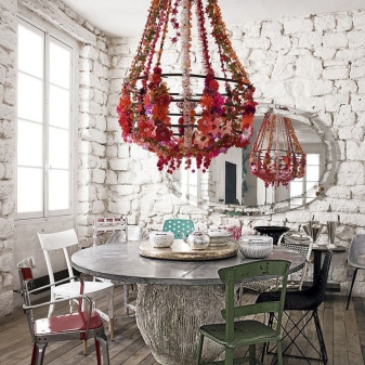 На мода е и еклектиката. Можете успешно да играете на контрасти, например, да си купите модел, изработен от естествени материали в класически стил и да го закачите в кухнята, или да изберете опцията с кристални висулки на пластмасов фон. Всичко това ще ви помогне да създадете креативен дизайн за вашия апартамент..