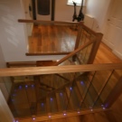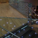 - Някои също предпочитат да инсталират лампи в парапета на стълбището. В този случай светлината обикновено е насочена настрани, но такова сияние не е много удобно. Осветлението в този случай няма да бъде много ярко и практично. Единственото предимство на подобно стълбищно осветление е, че по този начин ще изглежда много интересно и необичайно. Насочените светлинни лъчи разнообразяват интериора на стаята.
