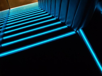 Сега някои хора купуват такива опции за осветление на стълби. Те са в състояние да осигурят мека светлина. Нещо повече, тяхната характеристика е, че осигуряват пълна липса на сенки. По този начин можете значително да увеличите безопасността си. Неоновите светлини са най -надеждните и издръжливи; такива светлини могат да издържат с години. Единственият недостатък на неоновите крушки е, че те са много крехки, така че трябва да се погрижите за тяхната защита..