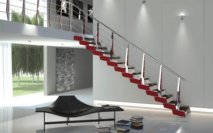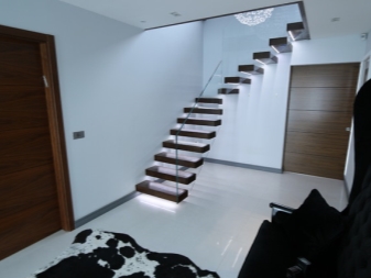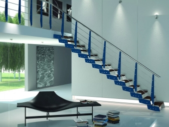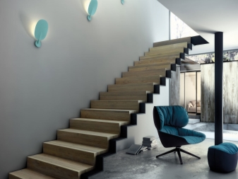 - Ако стълбището е декорирано в студени цветове или е железен модел, тогава студено осветително тяло също е подходящо за вас. Последният вариант е идеален за апартаменти и къщи с високотехнологичен интериор..