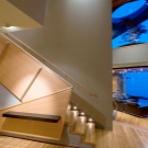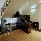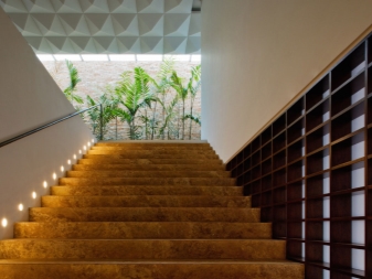 - Подовите прожектори са способни на подчертайте красивото масивно стълбище във вилата. Те имат необичаен дизайн и са разположени вертикално между участъците. Такова осветление изглежда много красиво и романтично. Приглушената светлина ще се превърне в акцент във вашия интериор и перфектно ще осветява стъпалата.