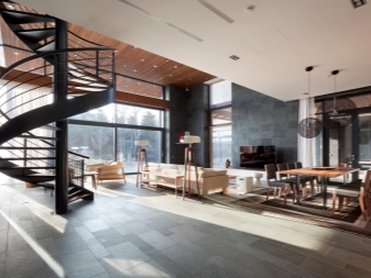 - Ако вашият интериор има красиво вита стълба, тогава една голяма лампа, разположена в средата на такава винтова конструкция, е идеална за нейното осветяване. Такова осветление може да бъде допълнено с лампи по стъпалата, те ще направят интериора по -елегантен и луксозен..