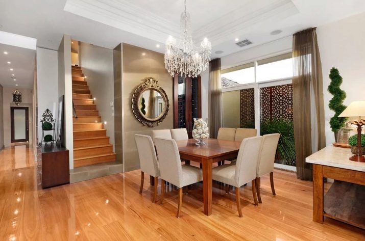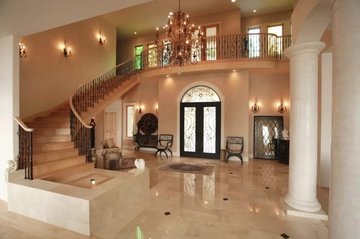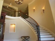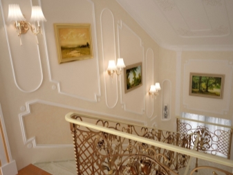 Така че можете да окачите голям полилей и да монтирате малки прожектори в страните на стълбите. Тази комбинация ще изглежда много красива. За тези, които се стремят да дадат на една стая тържественост или да я направят по -класическа и помпозна, лампите с насочена светлина са идеални. Лампите с разсеяно сияние са по -подходящи за създаване на селска уютна атмосфера в семпъл интериор на къщата..