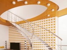 - Поставянето на тавана също е много често.. Опциите за осветление на тавана на стълбище трябва да се обмислят, ако височината на тавана е около 3 метра. Човек със стандартен ръст с протегната ръка не трябва да достига до такава лампа. Единственият недостатък на тази подредба на лампите е, че тя е в състояние да скрие стълбищното пространство..