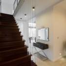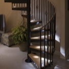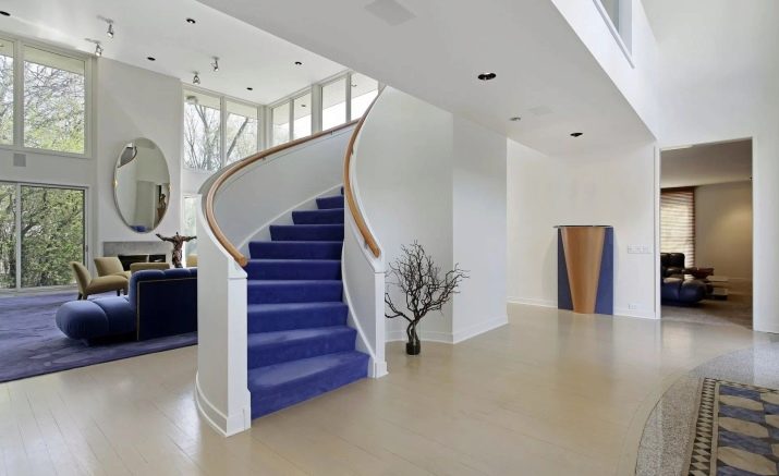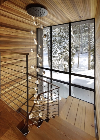 Също така в много съвременни апартаменти и къщи стълбите се осветяват поетапно в основата на всяка стъпка. Тази опция е идеална за почти всеки интериорен стил. За по -модерен дизайн можете да изберете ярки цветни LED стъпала. Обемната падаща лампа в средата в ансамбъл с точково осветление изглежда много хубаво в интериора на къща с вита стълба. Освен това в този случай всички осветителни устройства имат един и същи вид и цвят на осветлението и подобен дизайн..
