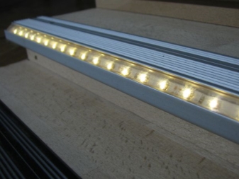 - Сега стана много популярно монтирането на лампи в протектора.. В този случай LED лампи се монтират под алуминиевия профил. Те са способни да създават мека разсеяна светлина. Те ще станат не само функционален елемент, но и декоративна част на стълбището. По този начин можете да подчертаете всяка стъпка и да направите подчертаването по -оригинално..