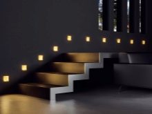 - Обичайно е също да има лампи над стъпалата. Всяко такова устройство е монтирано директно над стъпалото в тавана. В този случай се използват малки LED крушки със средна мощност. Тъй като в този случай ще има много лампи, те ще бъдат разположени много често. Ето защо е по -добре такива устройства да са тъмни..