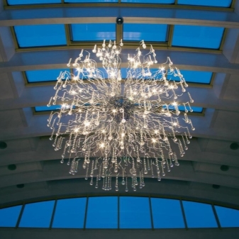За голяма просторна зала е допустимо да се състави композиция от няколко сложни окачени конструкции. Тази доста смела техника ще ви позволи да подчертаете височината и обема на помещението, като същевременно добавите помпозност и величие към него. Ако обзаведете такава зала в необичаен стил, ще можете да създадете наистина незабравим интериор..