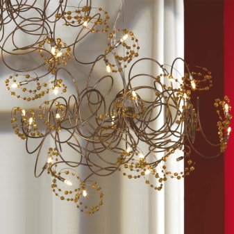 - За модерен предпочитание трябва да се даде на фантастични модели със сложни конфигурации, например чифт тъкани пръстени. Можете да играете на контрасти, например да изберете най -простия полилей (например висящ кръг с кух център) и да го украсите с разнообразен декор: кристални висулки или LED елементи.