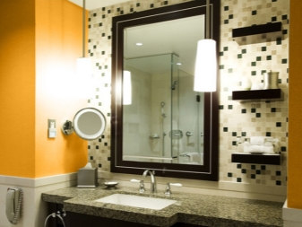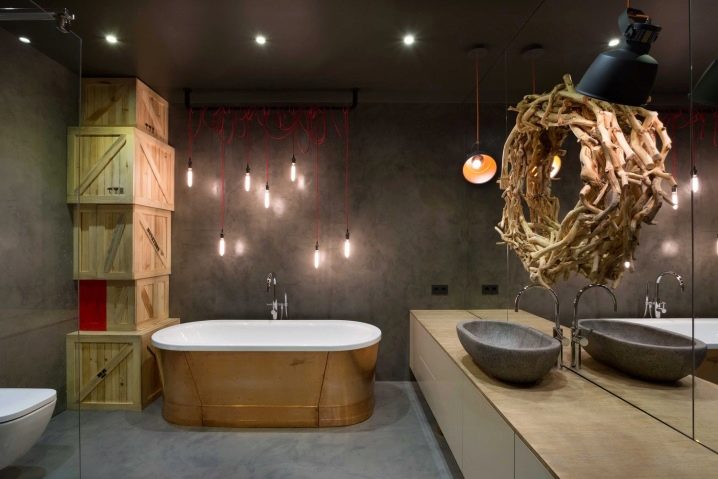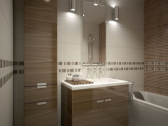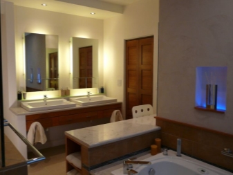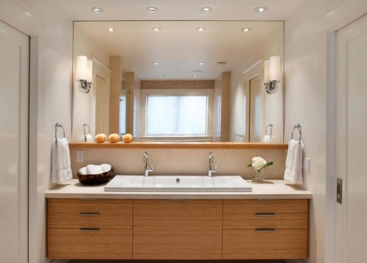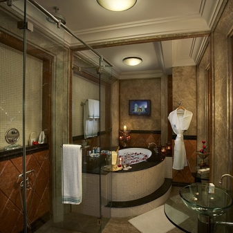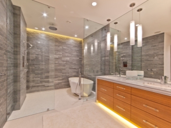 И, разбира се, трябва да се вземе предвид и цялостният дизайн на стаята. Банята се счита за място на уединение и релакс, поради което трябва да се обърне специално внимание на дизайна на нейния светлинен дизайн. Трябва да има достатъчно светлина, а лампите трябва да се вписват максимално в цялостния интериор и в същото време да създават спокойна и спокойна атмосфера.