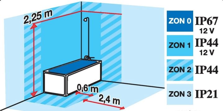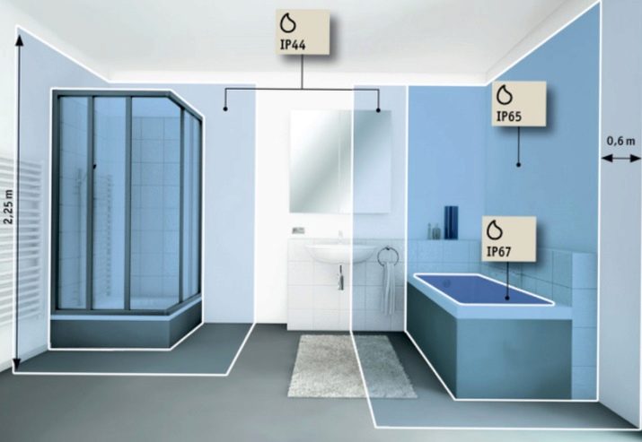 Цялото помещение за баня може условно да бъде разделено на четири големи зони, които се различават една от друга по степента на влажност. Необходимо е да се инсталират влагоустойчиви осветителни устройства въз основа на тяхното отчитане, тъй като неправилният избор на устройство за определена зона може да доведе до наранявания, къси съединения или в най-добрия случай до неправилна работа на самото устройство.