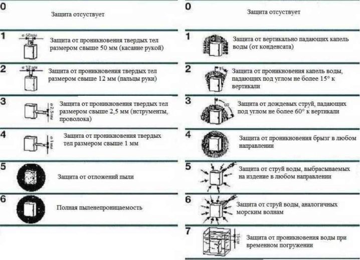 Има още една характеристика, която се състои в наличието на специална маркировка за степента на защита на лампата от вода. Тези водоустойчиви устройства попадат в няколко категории в зависимост от това колко ефективно и безопасно могат да работят при влажни условия. Повече подробности за този параметър ще бъдат разгледани по -долу..