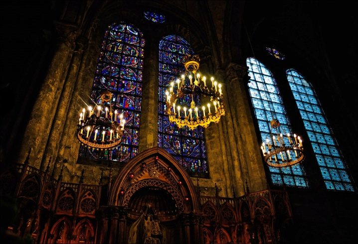 С помощта на правилно организирано осветление можете да се върнете в определена епоха. Готическият стил на Средновековието е по -подходящ за просторни стаи. Тяхната отличителна черта беше специалната форма на отвори за врати и прозорци и лампи от ковано желязо. Отразената светлина от витражите създава изключителен визуален ефект. В съвременната интерпретация не е необходимо да се използват свещи, тъй като има лампи със специална форма..
